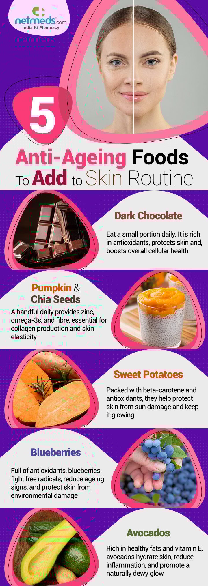 In short, small daily choices can have a big impact on long-term anti-ageing benefits. While conscious and consistent skincare routines are essential for achieving a glowing, wrinkle-free complexion, your diet plays an equally important role. Incorporate these skin-friendly foods into your meals at least three times a week to naturally boost your skincare efforts and support healthy, youthful skin from within. Foray through the infographic below: